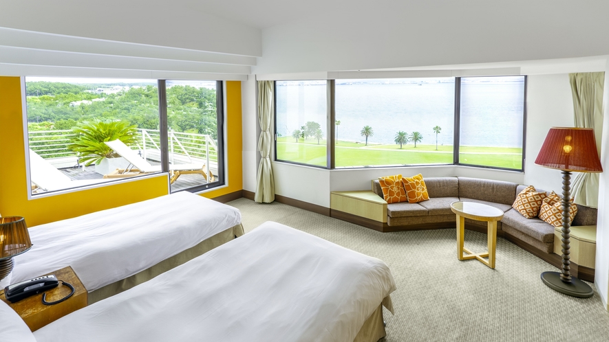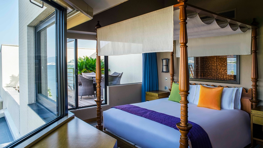 客室は全98室・13タイプで構成され、すべてオーシャンビューとなっており、博多湾を望む開放感のある滞在が楽しめます。インテリアは色彩豊かなデザインで統一されており、一般的なビジネスホテルとは異なるリゾート感のある空間が魅力です。