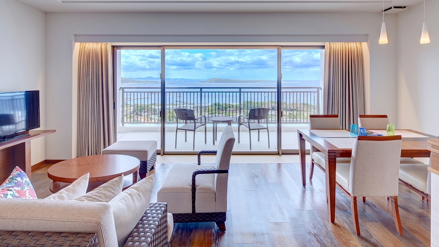 客室は全室55㎡以上の広々としたコンドミニアムタイプ+オーシャンビューとなっており、リビングスペースやキッチンを備えた設計が特徴です。開放感のある大きな窓からは東シナ海を一望でき、一般的なビジネスホテルとは一線を画す“長期滞在向けのリゾート空間”となっています。