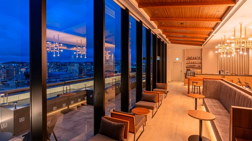 最上階にはフロントと屋外テラスがあり、那覇市街や海を一望できる開放的な空間が特徴。夕日や夜景を楽しめるスポットとしても人気です。