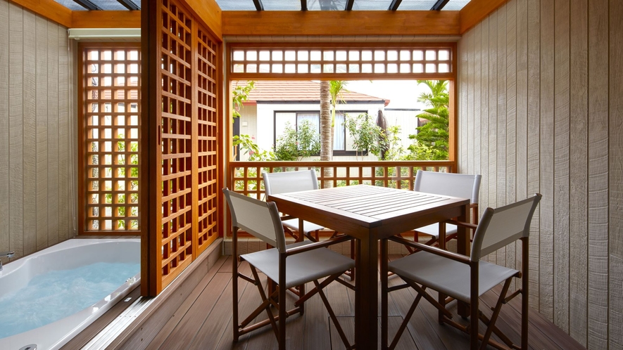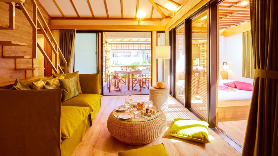 客室はすべてヴィラ(コテージ)タイプで、1棟に複数客室が配置されたつくりになっており、室内約55㎡+テラス付きの広々とした設計です。全室にジャグジーやロフト、洗濯機などが備わっており、まるで別荘のように過ごせる点が魅力です。