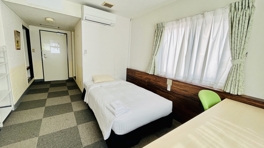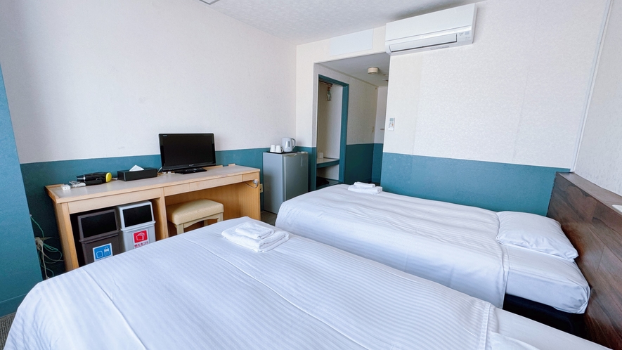 客室は全63室の中規模ホテルで、シングル・ツイン・トリプル・和洋室など多様なタイプを用意しています。全室15㎡以上と、一般的なビジネスホテルよりやや広めの設計で、Wi-Fi完備・基本設備も整っており、快適に滞在できる環境です。