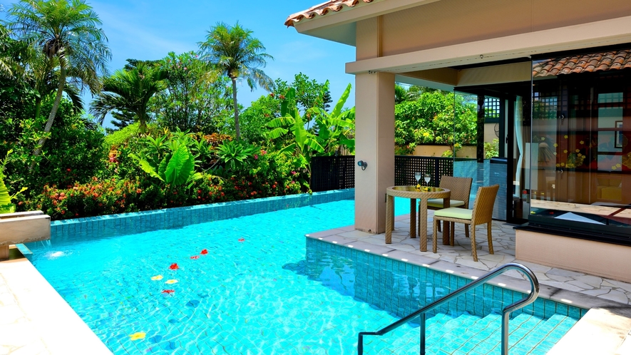 客室は全室スイートタイプ(約60㎡〜)という贅沢な設計で、アジアンリゾート風の落ち着いた空間が特徴です。さらに、約半数の客室にプライベートプール付きという高級仕様となっており、ヴィラタイプやジャグジー付き客室など、プライベート感の高い滞在が可能です。