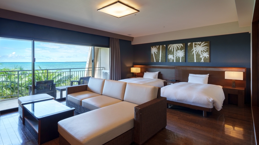 ホテルは「オーシャンズウィング」と「ヴィラガーデン」の2エリアに分かれており、開放感のある客室からプライベート感のあるヴィラタイプまで幅広く選べます。館内には大浴場・露天風呂・サウナ・プールなど設備が充実しており、リゾートらしい滞在が楽しめます。